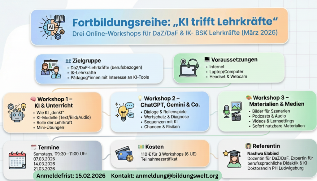Die Workshops richten sich an Lehrkräfte für Deutsch als Zweit- und Fremdsprache, IK- und BSK-Lehrkräfte sowie Pädagog*innen, die KI-Tools didaktisch sinnvoll, reflektiert und praxisnah im Unterricht einsetzen möchten.