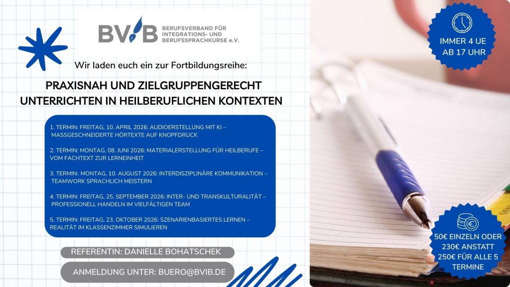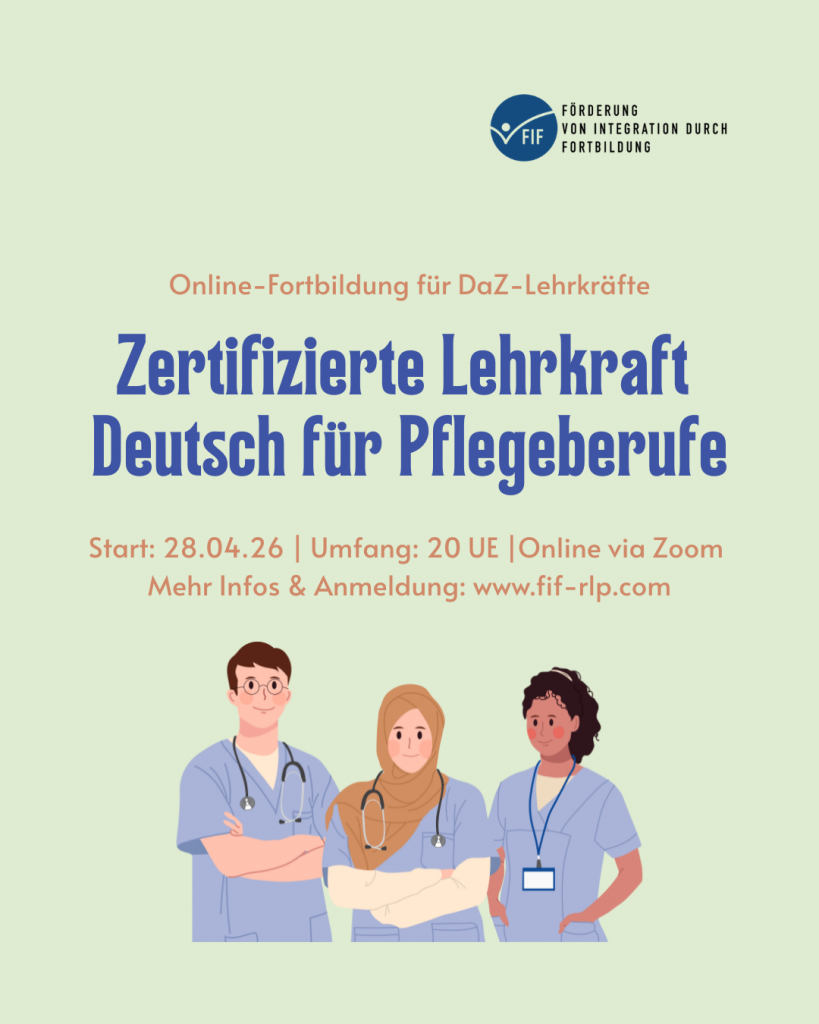 Diese Online-Fortbildung richtet sich an DaZ Lehrkräfte, die internationale Pflegefachpersonen sprachlich auf ihren Berufsalltag in Deutschland vorbereiten möchten. Im Fokus steht die Entwicklung praxisnaher, handlungsorientierter Unterrichtskonzepte für Pflegekurse auf den Niveaustufen B1/B2.